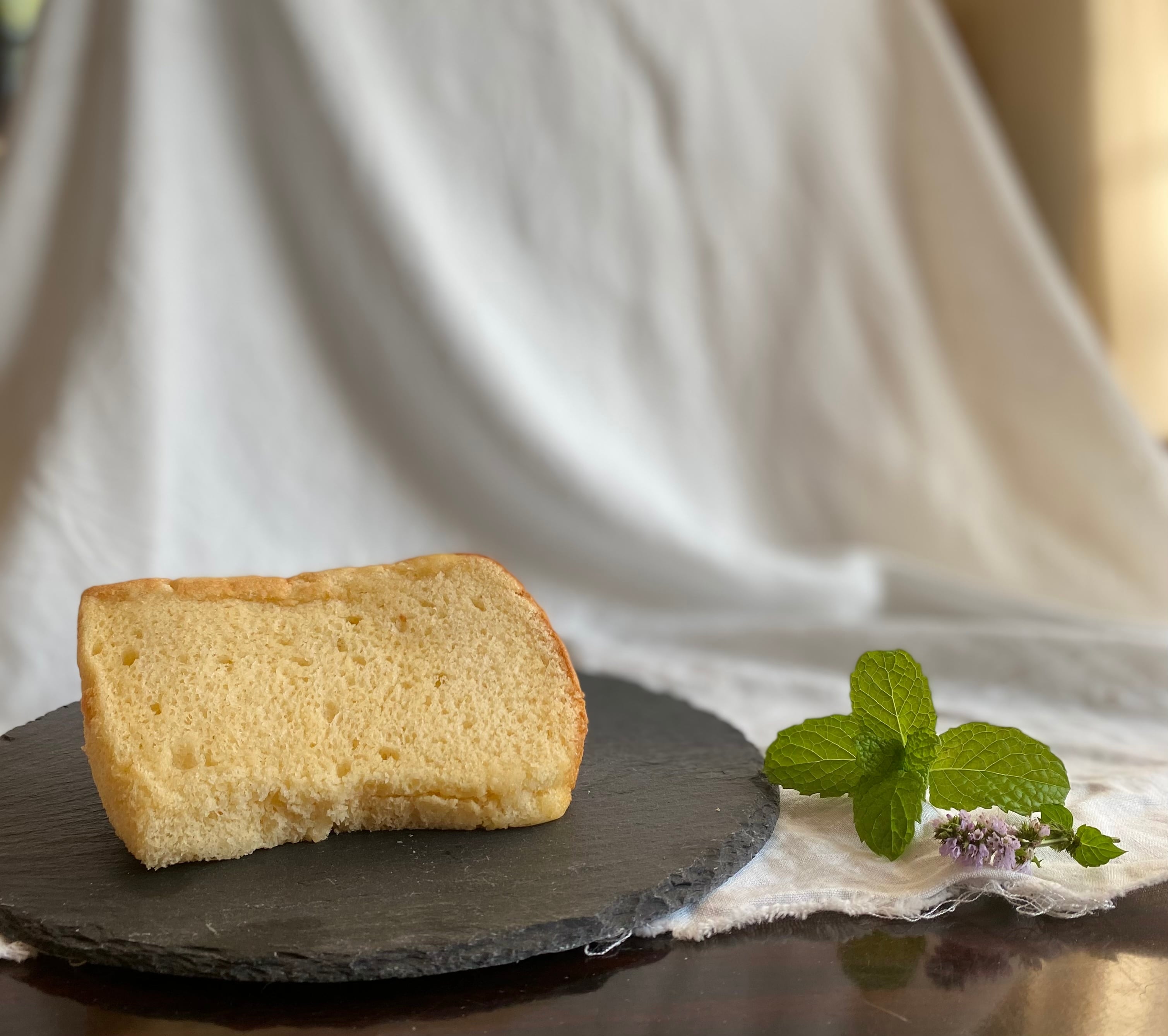 ふわふわ食感がたまらない当園のノンカフェインの柿の葉茶に合わせて焼きあげたグルテンフリーの米粉シフォンケーキ